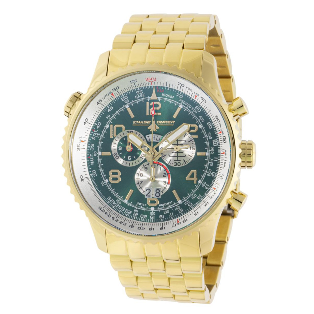 Este lindo relógio Chase Durer Flight Commander contém um movimento preciso além de uma caixa dourada Seu mostrador exibe um mostrador verde, prateado, metálico, protegido por um c