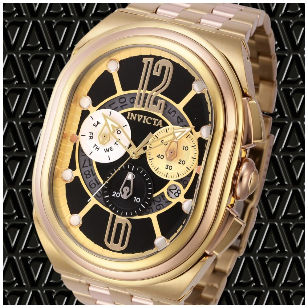Este impressionante relógio Invicta Lupah apresenta um movimento preciso e uma caixa dourada Seu mostrador preto de metal é envolto por um cristal Flame Fusion altamente protetor E