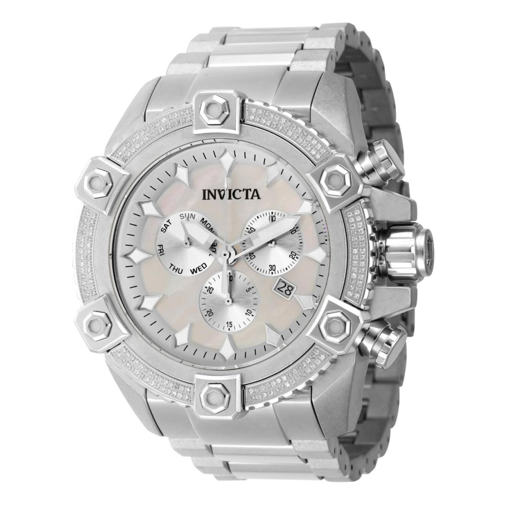 Este lindo relógio Invicta Pro contém um movimento preciso, além de 0,71 quilates de diamantes, sustentados por uma caixa de aço deslumbrante Seu mostrador exibe um mostrador branc