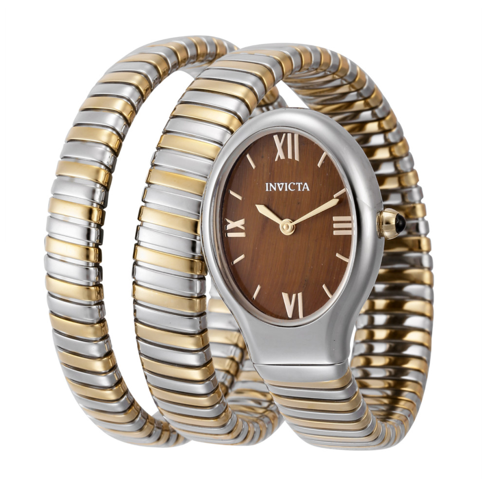 Este lindo relgio Invicta Mayamar contm um movimento preciso alm de uma caixa de ao. Seu mostrador exibe um mostrador marrom em forma de olho de tigre protegido por um cristal mine
