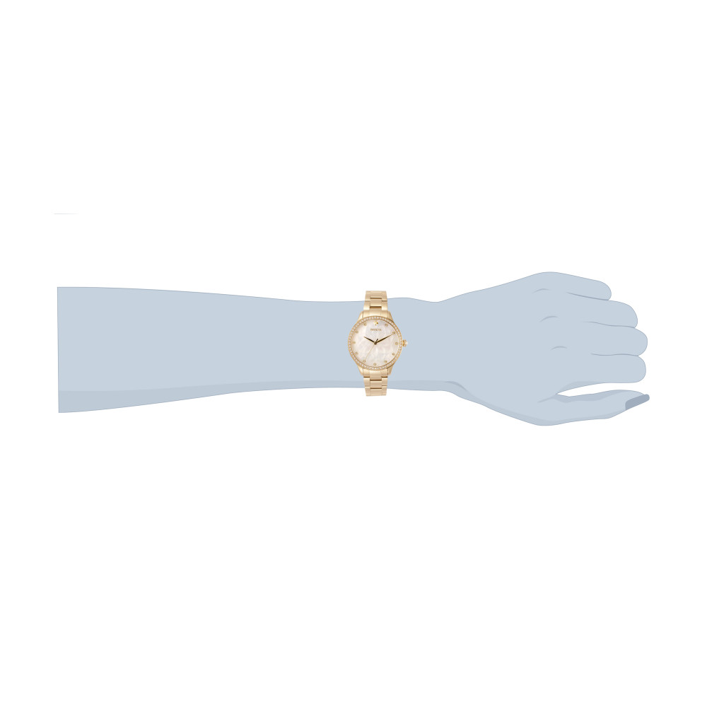 Este lindo relgio Invicta Wildflower contm um movimento preciso alm de uma caixa dourada. Seu mostrador exibe um mostrador branco em ostra protegido por um cristal Flame Fusion alt