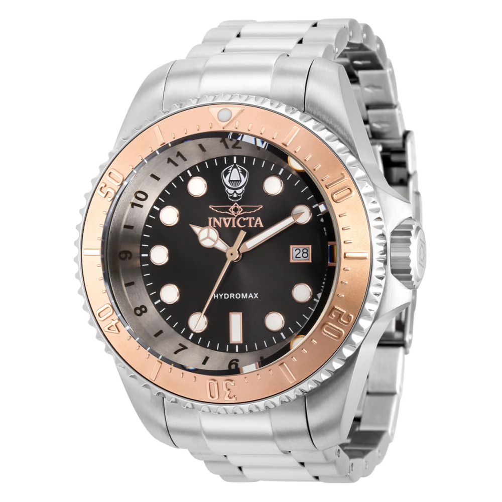 Este relgio Invicta Hydromax possui um movimento preciso e uma caixa de ao em ouro rosa, com mostrador de metal preto protegido por um Cristal Mineral de alta resistncia. A pulseir