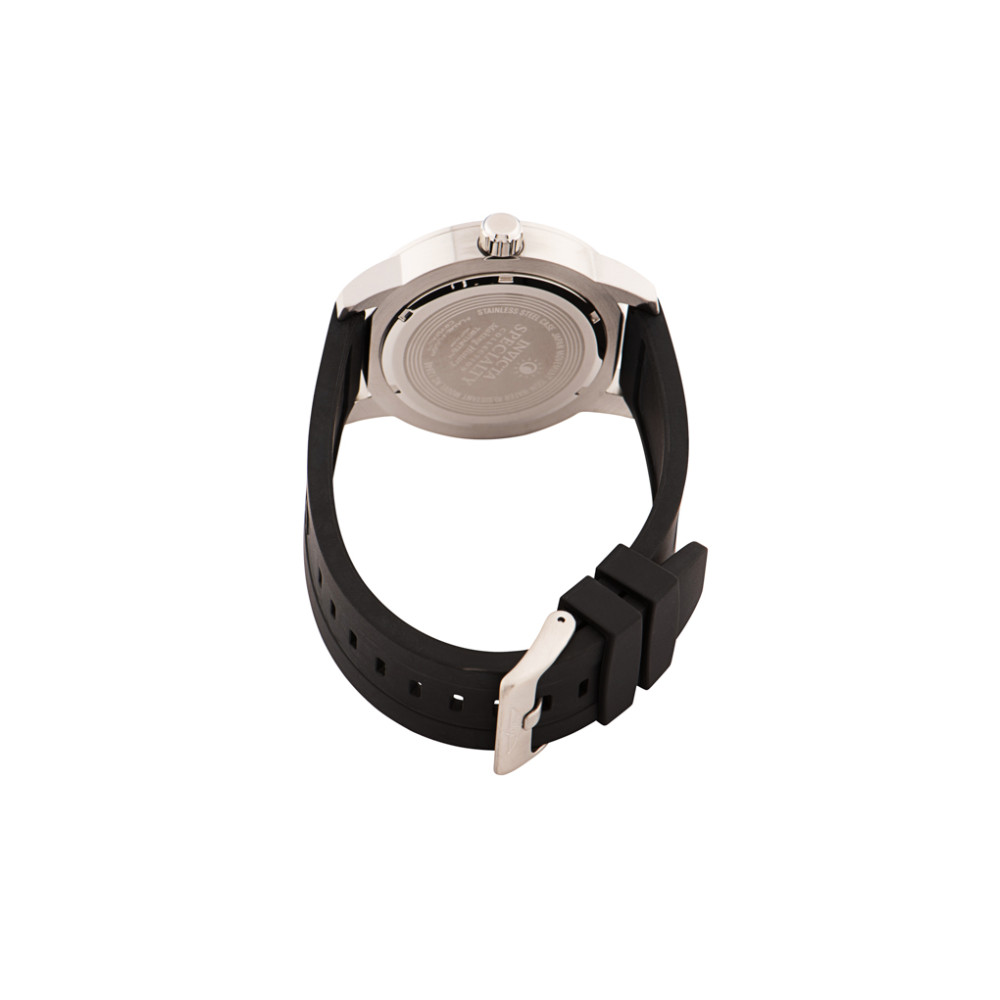 O mostrador protegido por um cristal Flame Fusion exclusivo e possui um design elegante com pulseira de silicone preta.