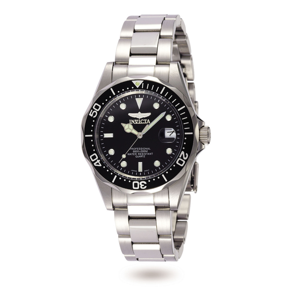 Este um relgio Invicta Pro com movimento preciso e caixa de ao. Seu mostrador de metal preto protegido por um Cristal Mineral de alta resistncia. A pulseira de ao inoxidvel e o rel