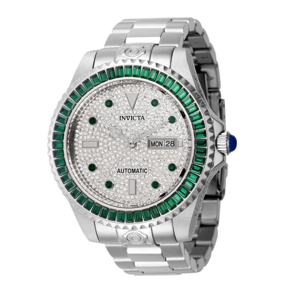 Este lindo relgio Invicta Pro contm um movimento Automtico preciso alm de uma caixa de ao. Seu mostrador exibe um mostrador de metal prateado, pavimentado, protegido por um Cristal