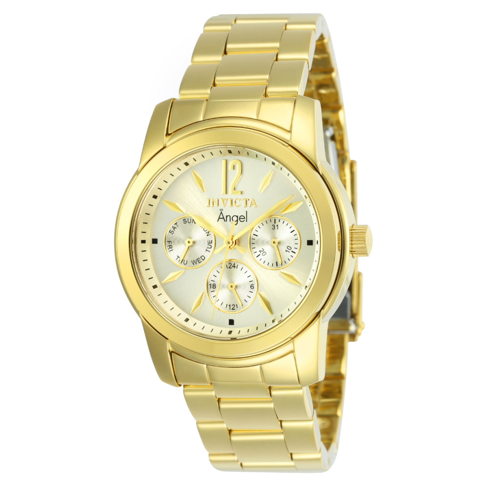 Este atraente relógio Invicta da coleção Angel é alimentado por um movimento de quartzo preciso, com uma caixa de ouro. Seu mostrador é decorado por um mostrador de metal dourado e