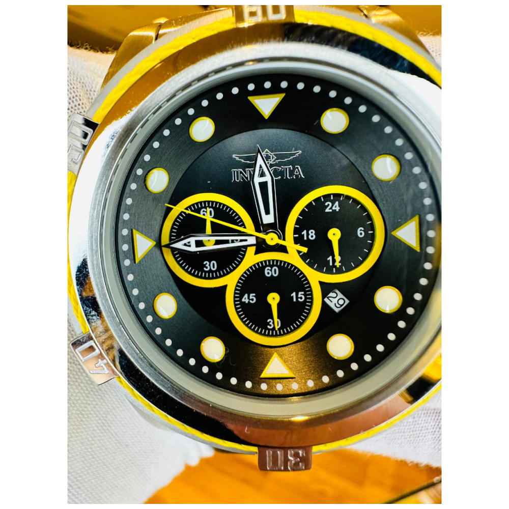 Este belo relógio Invicta Bolt contém um movimento de quartzo preciso, além de uma caixa de aço amarela. Sua face exibe um mostrador de metal amarelo, preto, protegido por um Crist