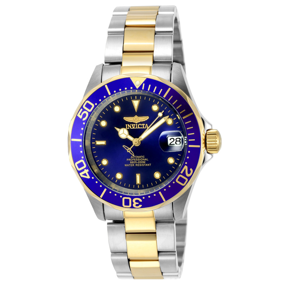 Este relgio Invicta da coleo Pro possui um movimento Automtico preciso e uma caixa de ao dourada. Seu mostrador decorado por um mostrador de metal azul e protegido por um resistent
