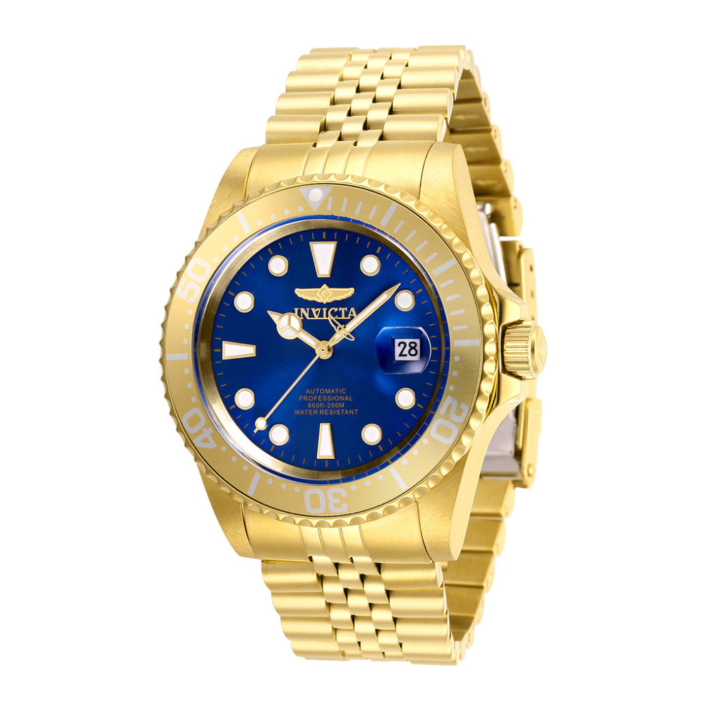 Relógio Masculino Automático Pro Diver, Invicta 30097, Dourado e Azul: Este impressionante relógio Invicta Pro Diver apresenta um movimento automático preciso, bem como uma caixa dourada.