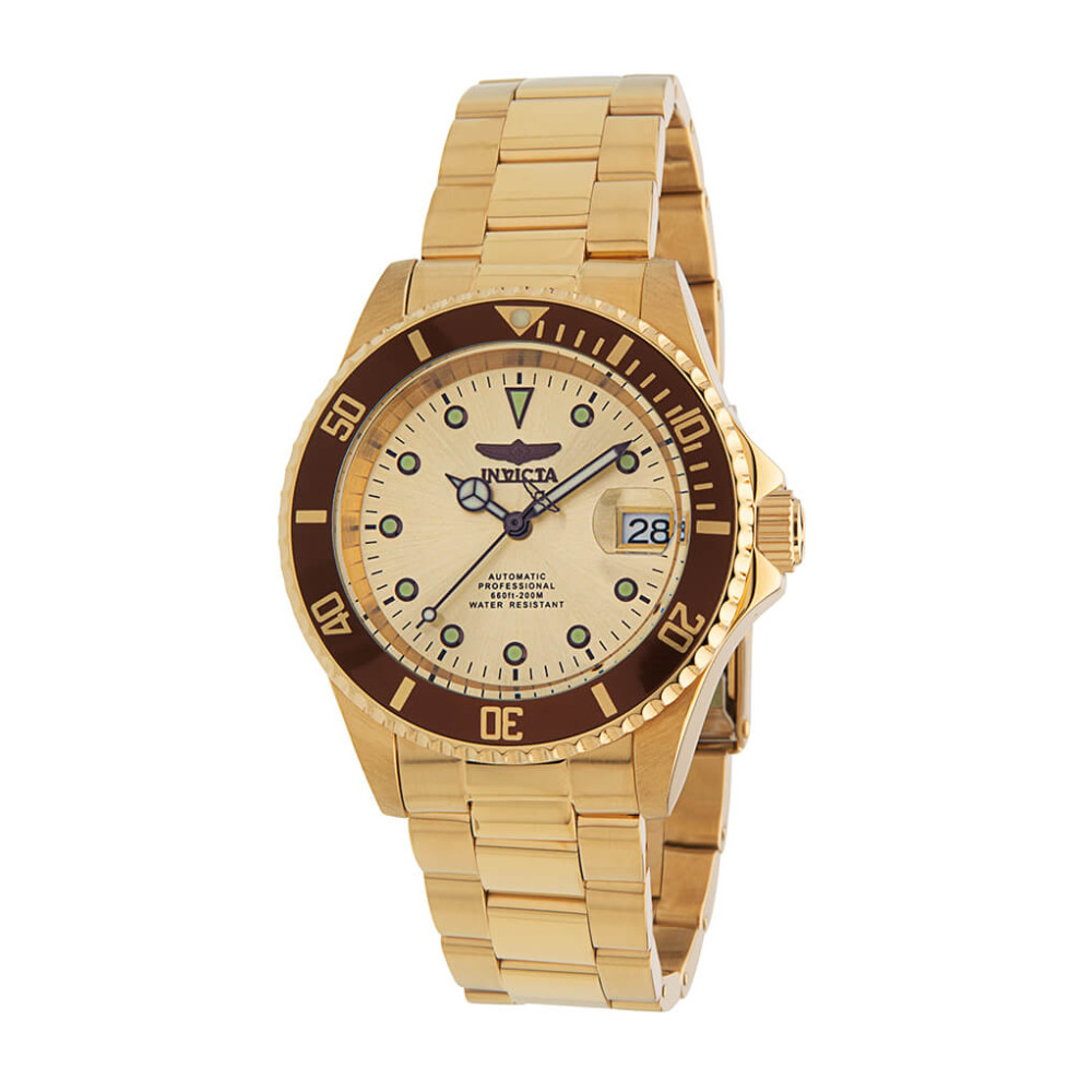 Este impressionante relógio Invicta Pro Diver apresenta um movimento automático preciso, bem como uma caixa dourada. Seu mostrador de metal dourado é envolto por um cristal mineral