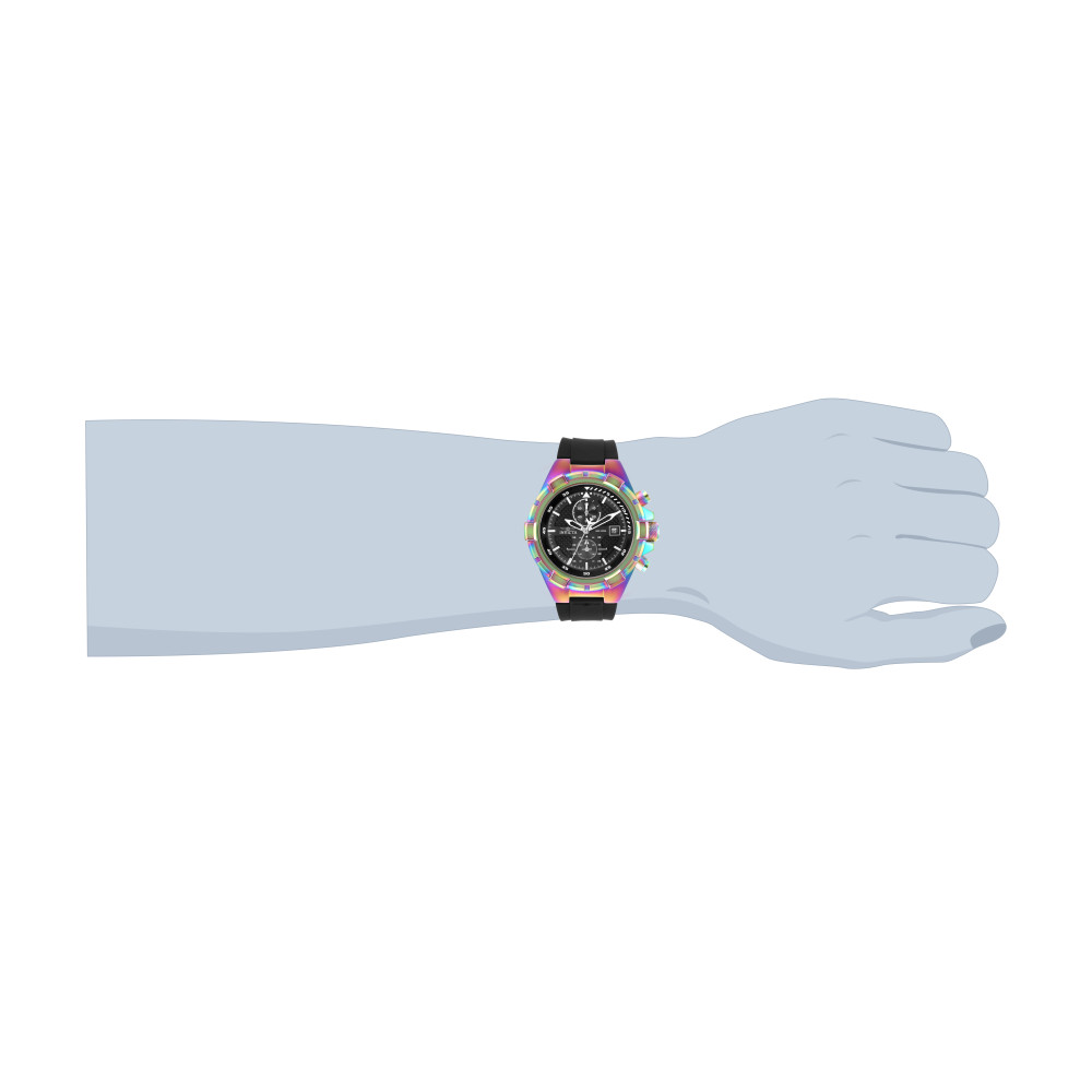 Este atraente relógio Invicta da coleção Aviator é movido por um movimento de quartzo e uma caixa iridescente sólida. Seu mostrador é decorado por um mostrador de metal preto e pro
