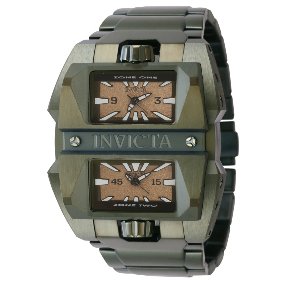 Este belo relógio Invicta Akula contém um movimento de quartzo preciso, além de uma caixa verde clara. Seu mostrador exibe um mostrador de metal cáqui protegido por um Cristal Flam