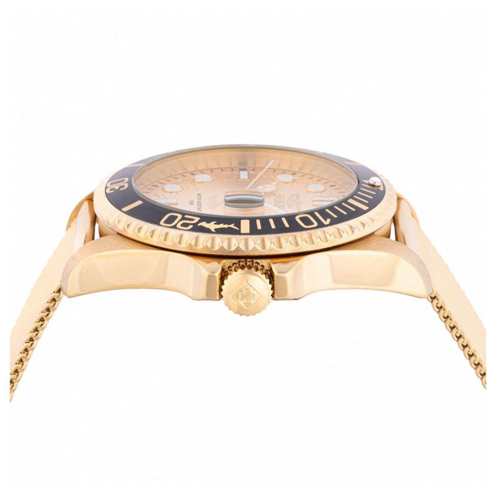 Com design elegante, possui mostrador dourado, caixa em aço de 43mm, função de bisel unidirecional e coroa rosqueada.