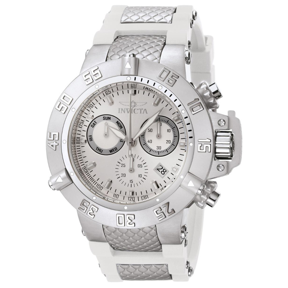 Este lindo relgio Invicta Subaqua contm um movimento preciso alm de uma caixa de ao. Seu mostrador exibe um mostrador de metal prateado antigo protegido por um cristal Flame Fusion