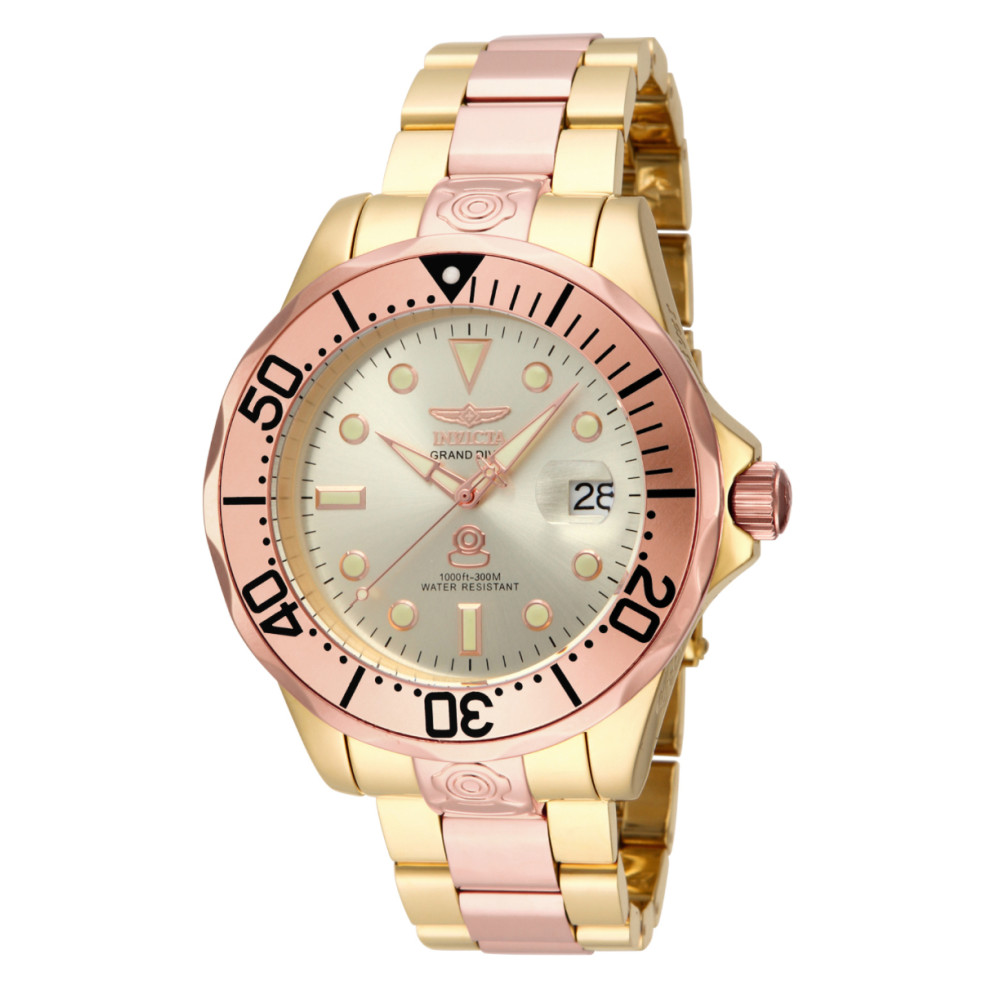 Este lindo relógio Invicta Pro Diver contém um movimento automático preciso, além de uma caixa em ouro rosa. Seu mostrador exibe um mostrador de metal dourado protegido por um Cris