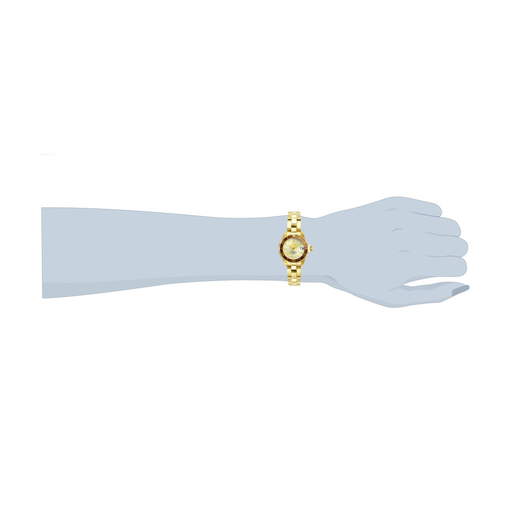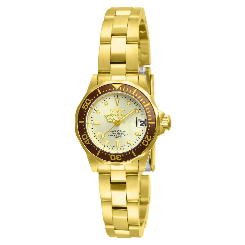 Relógio Pro Feminino 23,5 mm. Ouro 12527: Este impressionante relógio Invicta Pro apresenta um movimento preciso e uma caixa dourada Seu mostrador de metal champanhe é envolto por um cristal mineral altamente protetor Este relógio é finalizado por uma forte pulseira de ouro e aço inoxidável e oferece resistência à água de 100 m Mergulhe em qualquer horizonte usando a orientação firme do Invicta Pro Clássico e elegante, o funcionamento interno é forjado com variações de movimentos ousados Construídos com destreza confiante, a fortaleza com a qual esses relógios funcionam torna o Pro a quintessência em desempenho Desde a fundação da Invicta há mais de um século até os dias atuais, a inovação e a excelência têm estado no centro de cada era e coleção ao longo da história da marca Aqui nas lojas Invicta, você encontrará a maior seleção de relógios Invicta em qualquer lugar online, além de atendimento ao cliente superior, garantia de 3 anos e sempre o melhor valor Em alguns casos, as cores nas imagens podem ser ligeiramente diferentes do produto real Especificações do produto Cor do mostrador Champanhe Material do mostrador Metal Tamanho da caixa 23,5 Tom da caixa Dourado Material da caixa Aço Função da moldura unidirecional Tipo de coroa Push Cor luminosa Verde Material Luminoso Tritnite Tipo de movimento Fabricado na Suíça Não Componentes do movimento Japão Fornecedor de movimento TMI Calibre de movimento PC22A Material da pulseira Aço inoxidável Comprimento da banda mm 170 Tamanho da banda mm 12 Tipo de fivela Banda intercambiável Não Tipo de fecho dobrável, de segurança Código da família do produto PF0764 Tom de banda Tom dourado Tipo de cristal Mineral Função de cronógrafo Nenhuma Função de calendário Data Categoria Relógios Gênero Feminino Mostrador Esqueleto Não Cronógrafo Não