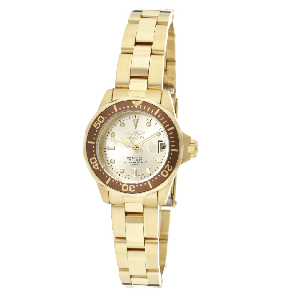 Este impressionante relógio Invicta Pro apresenta um movimento preciso e uma caixa dourada Seu mostrador de metal champanhe é envolto por um cristal mineral altamente protetor Este