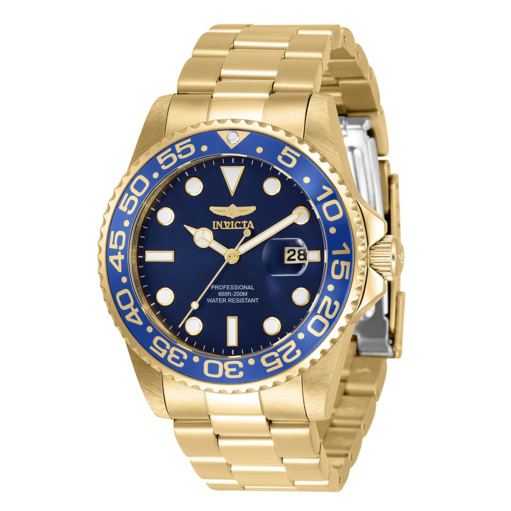 Este incrível relógio Invicta da coleção Pro oferece um movimento exato, com uma incrível caixa dourada O mostrador exibe um mostrador azul de metal protegido pelo nosso exclusivo&