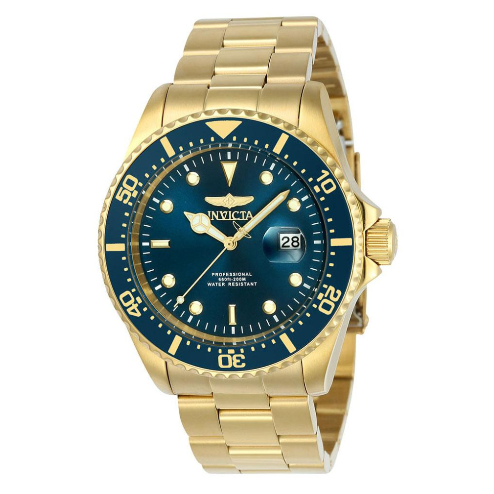 Este incrível relógio Invicta da coleção Pro oferece um movimento exato, com uma incrível caixa dourada O mostrador exibe um mostrador de metal azul marinho protegido pelo nosso ex