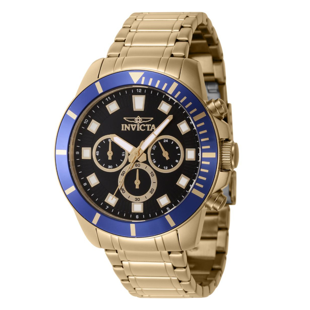 Este lindo relógio Invicta Pro contém um movimento preciso além de uma caixa dourada Seu mostrador exibe um mostrador preto de latão protegido por um cristal Flame Fusion altamente