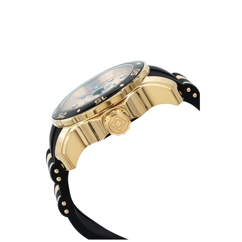 Este impressionante relógio Invicta Pro apresenta um movimento preciso e uma caixa dourada Seu mostrador dourado e metálico é envolto por um cristal Flame Fusion altamente protetor